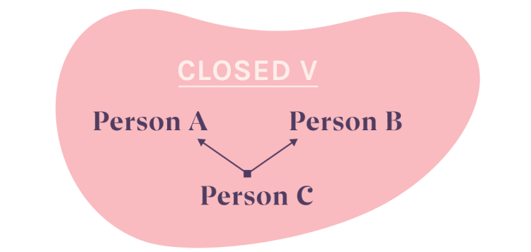 Imagine three people, each on each edge of a letter V. Only the person at the bottom of the V is connected to the two points at the top – the other people. Thus, in a closed V, one person is romantically involved with two others – these two people are not involved with each other.